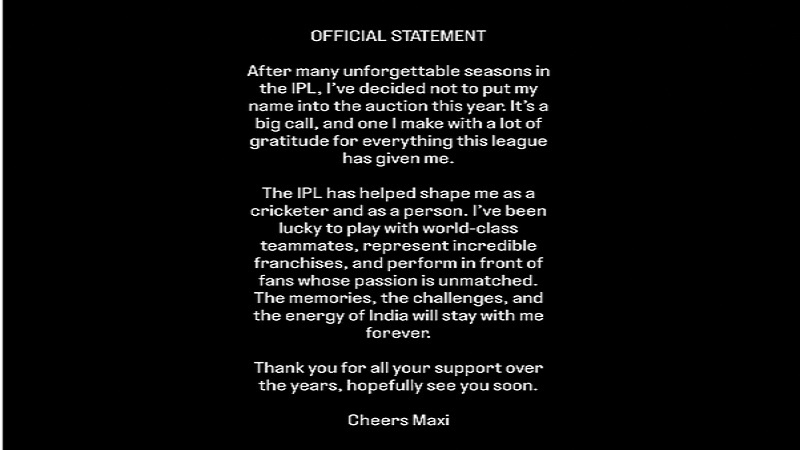37 سالہ گلین میکسویل نے اپنے سوشل میڈیا پلیٹ فارم ’انسٹاگرام‘ پر ایک پوسٹ جاری کر آئی پی ایل کو خیرباد کہنے کا اعلان کیا۔ انہوں نے لکھا کہ ’’آئی پی ایل میں کئی یادگار سیزن کے بعد میں نے اس سال اپنا نام نیلامی میں نہ دینے کا فیصلہ کیا ہے۔ یہ ایک بڑا فیصلہ ہے اور اس لیگ نے مجھے جو کچھ بھی دیا ہے، اس کا میں بہت شکرگزار ہوں۔‘‘ میکسویل نے یہ بھی لکھا کہ ’’آئی پی ایل نے مجھے ایک کرکٹر اور ایک انسان کے طور پر بنانے میں مدد کی ہے۔ میں خوش قسمت رہا ہوں کہ مجھے ورلڈ کلاس ٹیم میٹس کے ساتھ کھیلنے، شاندار فرنچائزی کی نمائندگی کرنے اور ایسے مداحوں کے سامنے پرفارم کرنے کا موقع ملا جن کا جذبہ بے مثال ہے۔ ہندوستان کی یادیں، چیلنج اور انرجی ہمیشہ میرے ساتھ رہیں گی۔ اتنے سالوں میں آپ کے سپورٹ کے لیے شکریہ، امید ہے جلد ہی ملیں گے۔‘‘