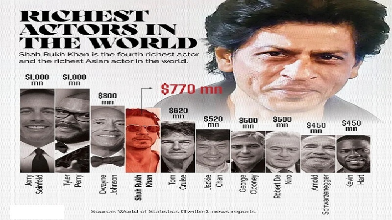 شاہ رُخ خان نے ہندوستان کے سب سے امیر اداکار کا درجہ برقرار رکھا ہے، اور اب عالمی سطح پر بھی کئی درجے اوپر پہنچ گئے ہیں۔ شاہ رُخ خان اب کھرب پتیوں کی فہرست میں شامل ہیں۔ فہرست کے مطابق، شاہ رُخ خان کی دولت میں زبردست اضافہ ہوا ہے۔ اب شاہ رُخ خان کئی بین الاقوامی مشہور شخصیات سے بھی زیادہ امیر ہیں، جن میں شامل ہیں،ٹیلر سوئفٹ ($1.3 بلین)آرنلڈ شوارزینیگر ($1.2 بلین)جیری سائنفیلڈ ($1.2 بلین)سلینا گومز ($720 ملین)۔