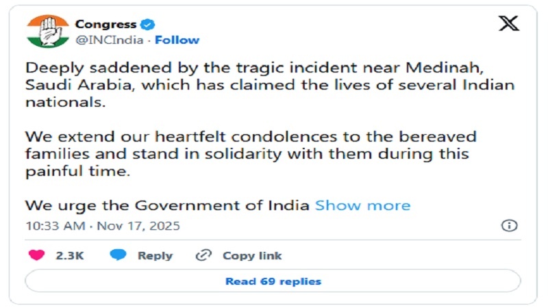 اس حادثہ پر کانگریس نے بھی اپنے شدید افسوس کا اظہار کیا ہے۔ کانگریس نے ’ایکس‘ ہینڈل پر لکھا ہے کہ ’’سعودی عرب میں مدینہ کے قریب پیش آنے والے اندوہناک واقعہ پر دلی افسوس ہے، جس میں متعدد ہندوستانی شہریوں کی جانیں چلی گئی ہیں۔‘‘ پارٹی مزید لکھتی ہے کہ ’’ہم غمزدہ خاندانوں سے اپنی گہری تعزیت کا اظہار کرتے ہیں اور اس مشکل وقت میں ان کے ساتھ کھڑے ہیں۔‘‘ ساتھ ہی لکھا ہے کہ ’’ہم حکومتِ ہند سے اپیل کرتے ہیں کہ تمام ضروری امداد فراہم کی جائے۔ زخمیوں کی جلد اور مکمل صحت یابی کے لیے ہماری دعائیں شامل ہیں۔‘‘