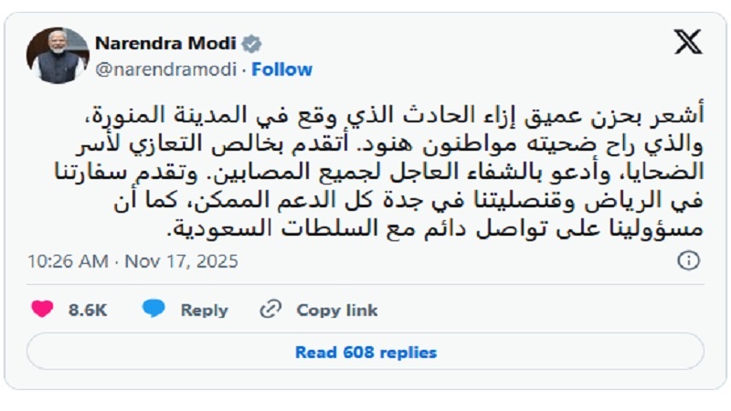 سحرنیوز/ہندوستان: موصولہ اطلاعات کے مطابق، اس غمناک حادثہ پر ہندوستانی وزیر اعظم نریندر مودی نے شدید رنج و غم کا اظہار کیا ہے۔ انھوں نے سوشل میڈیا پلیٹ فارم ’ایکس‘ پر جاری کردہ ایک پوسٹ میں لکھا ہے کہ ’’مدینہ میں ہندوستانی شہریوں کے ساتھ ہوئے حادثہ سے بے حد غمزدہ ہوں۔ متاثرہ کنبوں کے تئیں میری ہمدردی ہے۔‘‘ وہ مزید لکھتے ہیں کہ ’’میں حادثہ میں زخمی افراد کے جلد ٹھیک ہونے کی دعا کرتا ہوں۔ ریاض میں واقع ہمارا سفارت خانہ اور جدہ میں قونصل خانہ ہر ممکن مدد مہیا کرا رہے ہیں۔ ہمارے افسران بھی سعودی عرب حکومت کے افسران سے رابطے میں ہیں۔‘‘