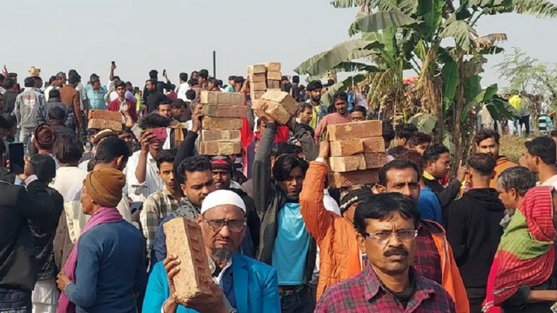 سنگ بنیاد کی تقریب میں شریک لوگوں نے اپنے ہاتھوں میں ہندوستانی قومی پرچم اٹھا رکھا تھا اور بہت سے لوگ مسجد کی تعمیر کے لیے اینٹیں لا رہے تھے۔