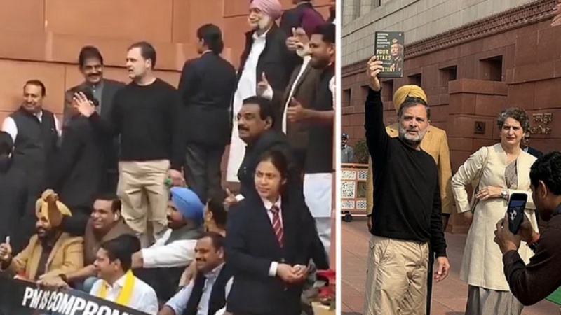 گزشتہ روز اراکین کی معطلی کے بعد آج بھی کانگریس اور دیگر اپوزیشن جماعتوں کے رہنماؤں نے پارلیمنٹ کی سیڑھیوں اور مکر دوار کے قریب احتجاجی مظاہرہ کیا۔ مظاہرین نے ہاتھوں میں پوسٹر اٹھا رکھے تھے جن پر وزیر اعظم کے خلاف سخت نعرے درج تھے-