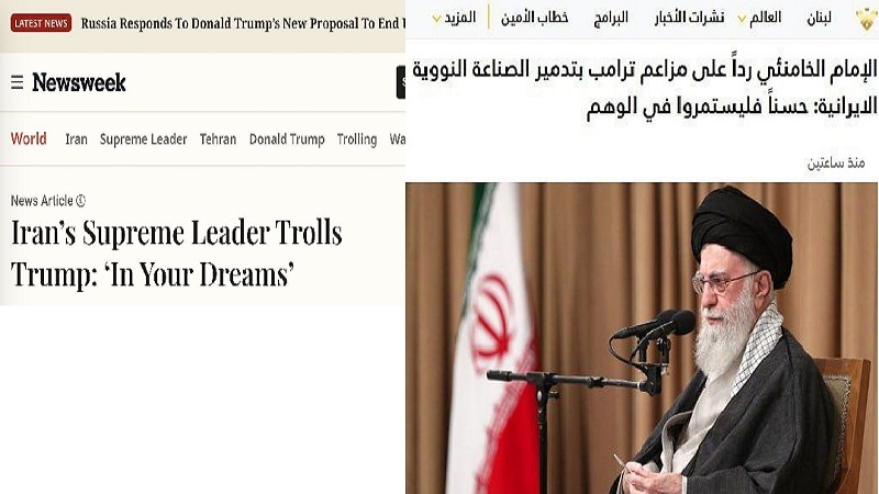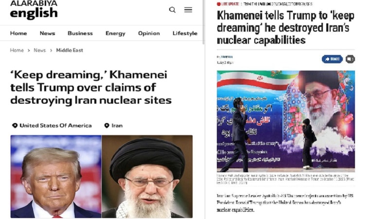 Times of Israel / i24news اور دیگر عبرانی/انگریزی ذرائع نے رہبر کے طنزیہ بیان کی طرف اشارہ کیا ہے — مثلاً “keep dreaming” یا “بہت اچھا، اسی خیال میں رہو” — کو ہیڈ لائن بنایا اور اس پر تبصرہ کیا کہ یہ جواب سیاسی طور پر سخت پیغام ہے۔ ان ذرائع نے ٹرمپ کے بیانات اور ان کے سیاسی معنی پر تیز کوریج دی۔