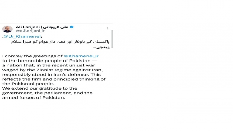 لاریجانی نے سوشل میڈیا پلیٹ فارم ایکس پر لکھا کہ رہبر انقلاب اسلامی نے فرمایا ہے کہ میں پاکستان کے معزز عوام کو سلام پیش کرتا ہوں۔ وہ قوم جس نے غیر منصفانہ جنگ میں پوری ذمہ داری کے ساتھ ایران کی حمایت کی۔ یہ مؤقف پاکستانی عوام کی مضبوط اور اصولی فکر کا عکاس ہے۔
