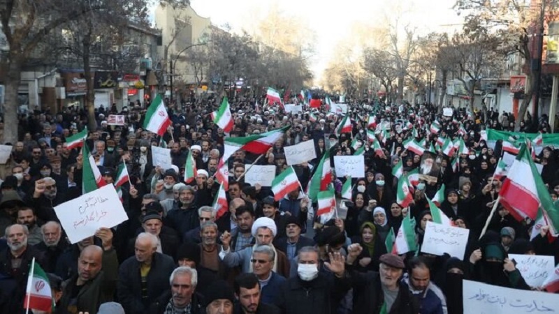 مظاہرین نے اعلان کیا کہ ہم ملک و قوم کے دشمنوں کے اشاروں پر اور ان کی مدد سے عوام کے برحق مطالبات و جذبات سے غلط فائدہ اٹھا کر انجام دی گئیں امریکہ اور صیہونی حکومت کے ایجنٹوں کی دہشت گردانہ کارروائیوں کی شدید مذمت کرتے ہیں۔