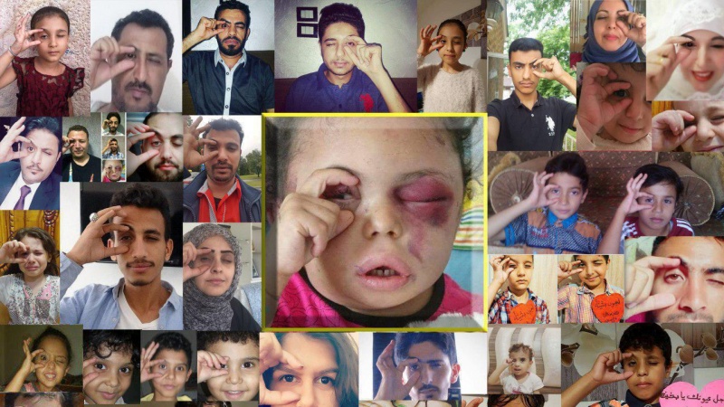 بثینہ نامی یہ یمن کی کم سن بچی ہے جس کے تمام گھر والے گزشتہ دنوں صنعا کے جنوب میں سعودی عرب کی بمباری میں مارے گئے۔ خود یہ بچی بھی بہت زیادہ زخمی اور نازک حالت میں ملبے کے نیچے سے باہر نکالی گئی۔ اسکے سر و صورت پر کئی جگہ شکستگی کے آثار نمایاں تھے۔ جس وقت ایک رپورٹر اس سے بات کرنے کے لئے اپنے کیمرے کے ساتھ اس کے پاس گیا تو اس نے اسے دیکھنے کے لئے اپنی سوجی ہوئی آنکھ کی پلکوں کو اپنے ہاتھ سے کھولا اور یہ دردناک لمحہ اس رپورٹر کے کیمرے میں قید ہو کر دنیا والوں تک پہونچ گیا۔سوشل میڈیا پر دل کو چھو لینے والے اس فوٹو کا آنا تھا کہ ایک زلزلہ سا بپا ہو گیا اور وہ دنیا بھر میں سماج کے مختلف طبقوں سے تعلق رکھنے والے لاکھوں انٹرنیٹ صارفین کی توجہ کا مرکز بن گیا۔جس کے بعد ہزاروں لوگوں نے اس بچی سے اظہار ہمدردی اور سعودی عرب کے وحشیانہ جنگی جرائم کی مذمت کرنے کے لئے بثینہ کے انداز میں اپنا فوٹو لے کر سوشل میڈیا پر شیئر کیا۔