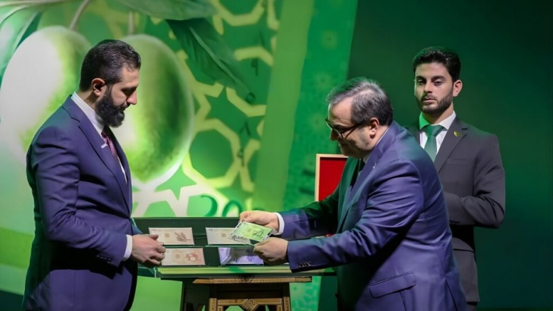 پیر کو شام میں سرکاری تقریب میں دمشق میں نئی شامی کرنسی جاری کی گئی، جس میں صدر احمد شرع اور شام کے سینٹرل بینک کے گورنر عبدالقادر الحصرہ نے نئے شامی نوٹوں کی رونمائی کی جس میں شامی صوبوں کی علامتیں ہیں۔