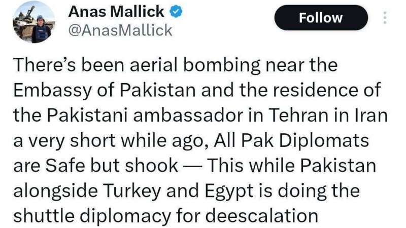 سحرنیوز/پاکستان: پاکستان کے صحافی انس مالک کے مطابق تہران میں پاکستانی سفارتخانے اور پاکستانی سفیر کی رہائشگاہ کے نزدیک اسرائیل نے بمباری کی ہے. تمام پاکستانی سفارتکار صحیح و سالم ہیں، لیکن شاک میں ہیں۔
