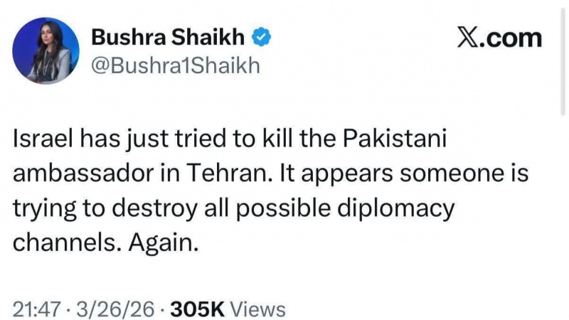 پاکستانی صحافی بشری شیخ نے بھی ٹویٹ کیا کیا ہے کہ اسرائيل نے تہران میں پاکستانی سفیر کو قتل کرنے کی کوشش کی ہے۔