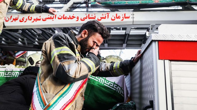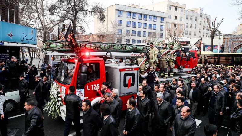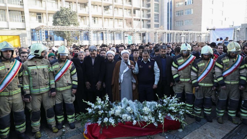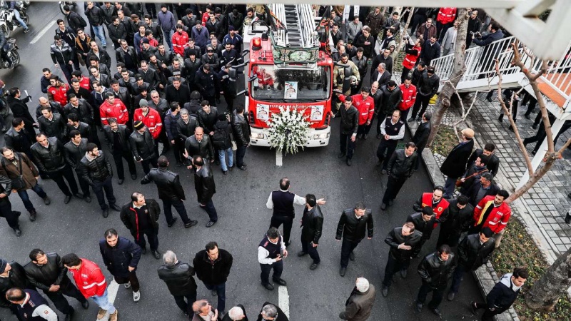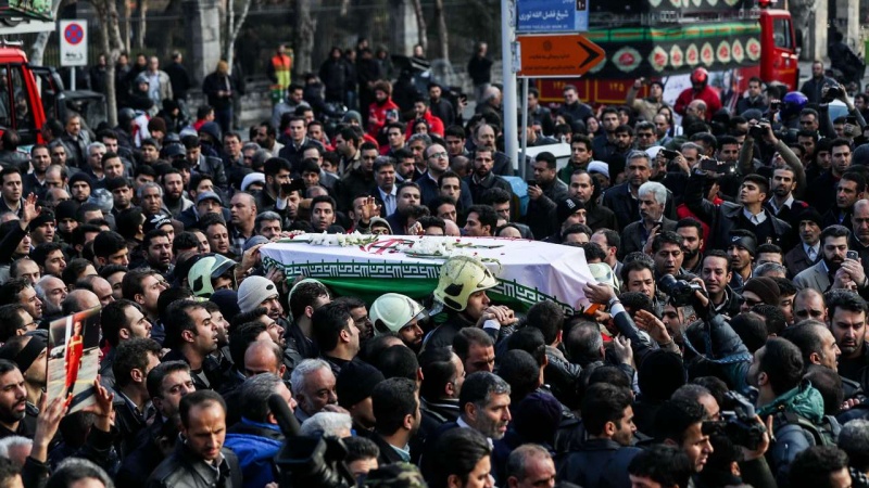 دارالحکومت تہران میں آگ بجھانے کے موقع پر بجلی کا کرنٹ لگنے سے اپنے خالق حقیقی سے ملنے والے فائر فائٹر کی تشیع جنازہ کے جلوس میں اعلی حکام اور عوام کی بڑی تعداد نے شرکت کی۔