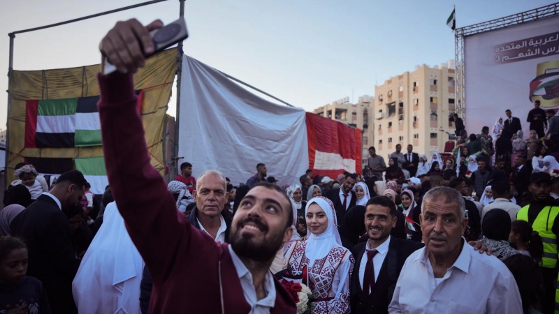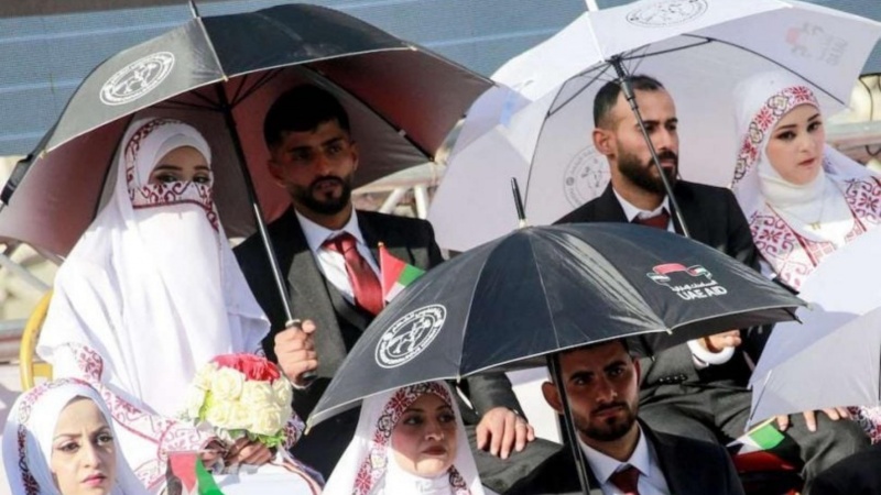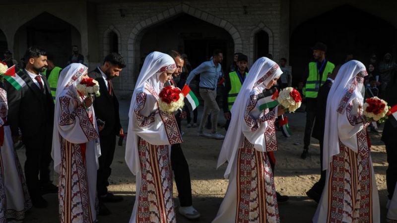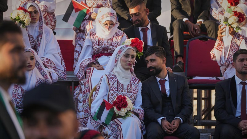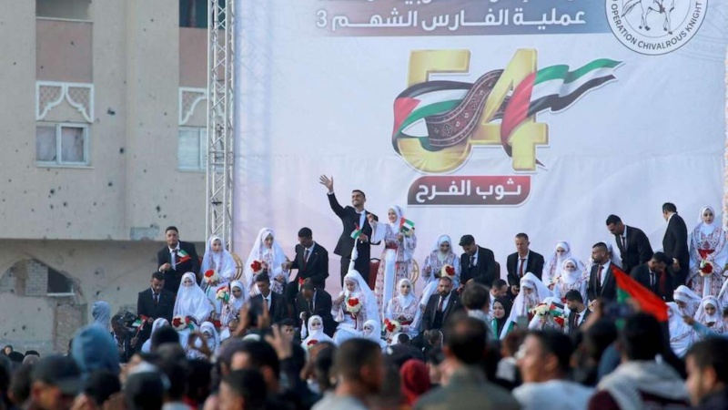 غزہ کے جنوبی شہر خان یونس میں یہ تقریب منعقد ہوئی، جہاں 54 فلسطینی جوڑوں نے اجتماعی شادی کی۔