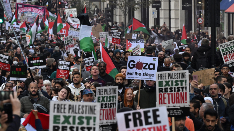 لندن میں ہزاروں لوگ فلسطینیوں پر ہونے والے اسرائیلی حملوں کے خلاف سڑکوں پر نکل آئے۔