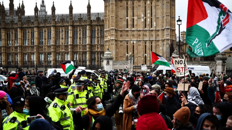 برطانوی پارلیمنٹ کے باہر فلسطین کی حمایت میں اجتماع (ویڈیو)