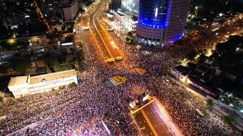 ہزاروں مظاہرین نے ایک بار پھر صیہونی حکومت کے وزیراعظم اور ان کی کابینہ کے خلاف تل ابیب میں بنیامین نیتن یاہو کی رہائش گاہ کے سامنے مظاہرہ کیا۔
